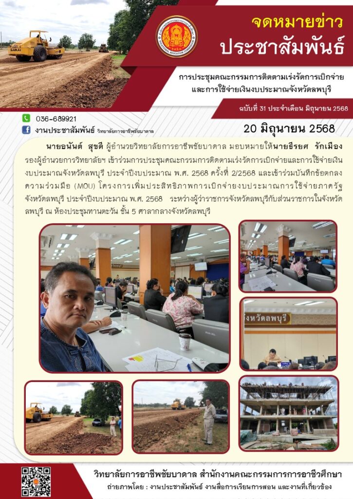 นายอนันต์ สุขดี ผู้อำนวยวิทยาลัยการอาชีพชัยบาดาล มอบหมายให้นายธีรยศ รักเมือง รองผู้อำนวยการวิทยาลัยฯ เข้าร่วมการประชุมคณะกรรมการติดตามเร่งรัดการเบิกจ่ายฯ และเข้าร่วมบันทึกข้อตกลงความร่วมมือ (MOU) ระหว่างผู้ว่าราชการจังหวัดลพบุรีกับส่วนราชการในจังหวัดลพบุรี ณ ห้องประชุมทานตะวัน ชั้น 5 ศาลากลางจังหวัดลพบุรี