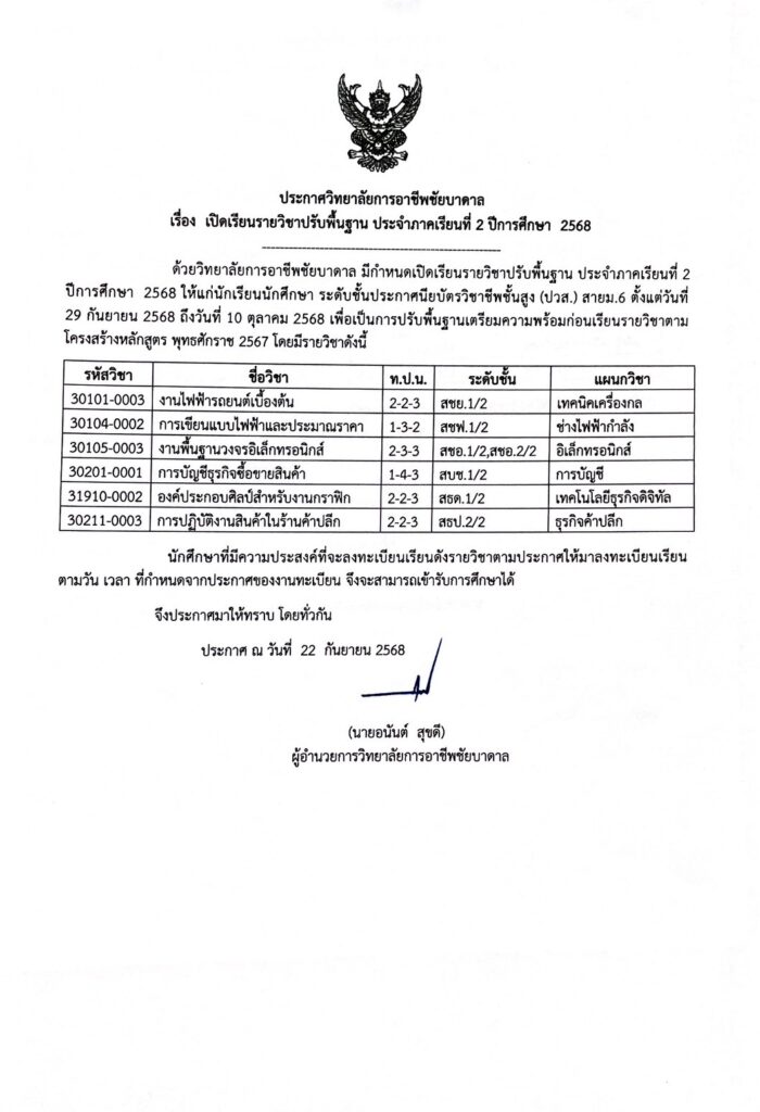 ข่าวสารรอบรั้ววิทยาลัย ประกาศวิทยาลัยการอาชีพชัยบาดาล เรื่อง เปิดเรียนรายวิชาปรับพื้นฐาน ประจำภาคเรียนที่ 2 ปีการศึกษา 2568 chaibadan 22 กันยายน 2025 Post navigation Previous Previous post: โครงการการปฐมนิเทศนักเรียน นักศึกษา ออกฝึกประสบการณ์วิชาชีพและฝึกอาชีพ (ทวิภาคี) ภาคเรียนที่ 2 ปีการศึกษา 2568Next Next post: ตั้งระบบไฟฟ้าส่องสว่างให้แก่ นางสาวสุนิตรา โยธาผาบ ณ บ้านเลขที่ 49/11 หมู่ที่ 5 ตำบลห้วยขุนราม อำเภอพัฒนานิคม จังหวัดลพบุรี ใส่ความเห็น ยกเลิกการตอบอีเมลของคุณจะไม่แสดงให้คนอื่นเห็น ช่องข้อมูลจำเป็นถูกทำเครื่องหมาย *ความเห็น * ชื่อ * อีเมล * เว็บไซต์ บันทึกชื่อ, อีเมล และชื่อเว็บไซต์ของฉันบนเบราว์เซอร์นี้ สำหรับการแสดงความเห็นครั้งถัดไป Δ Related News ข่าวสารรอบรั้ววิทยาลัย ส่งนักศึกษา เข้าฝึกอาชีพในสถานประกอบการ ณ บริษัทโทโฮกุ โซลูชั่น จำกัด 24 กันยายน 2025 ข่าวสารรอบรั้ววิทยาลัย การประชุมเชิงปฏิบัติการชี้แจงสร้างการรับรู้ ความเข้าใจแนวทางการดำเนินงานธนาคารหน่วยกิตการอาชีวศึกษา (Credit Bank) 23 กันยายน 2025