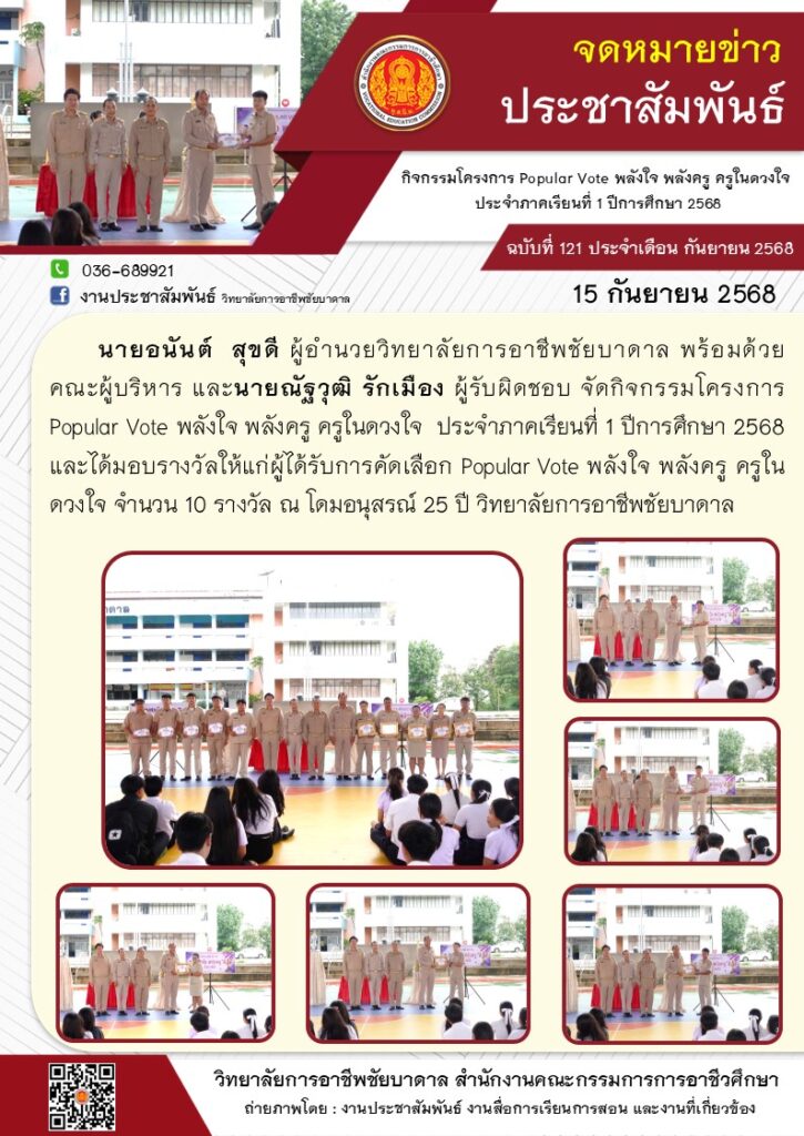 นายณัฐวุฒิ รักเมือง ผู้รับผิดชอบ จัดกิจกรรมโครงการ Popular Vote พลังใจ พลังครู ครูในดวงใจ ประจำภาคเรียนที่ 1 ปีการศึกษา 2568 และได้มอบรางวัลให้แก่ผู้ได้รับการคัดเลือก Popular Vote พลังใจ พลังครู ครูในดวงใจ จำนวน 10 รางวัล ณ โดมอนุสรณ์ 25 ปี วิทยาลัยการอาชีพชัยบาดาล