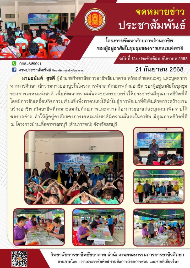 นายอนันต์ สุขดี ผู้อำนวยวิทยาลัยการอาชีพชัยบาดาล พร้อมด้วยคณะครู และบุคลากรทางการศึกษา เข้าร่วมการออกบูธในโครงการพัฒนาศักยภาพด้านอาชีพ ของผู้อยู่อาศัยในชุมชุมของการเคหะแห่งชาติ ณ โครงการบ้านเอื้ออาทรลพบุรี (ลำนารายณ์) จังหวัดลพบุรี
