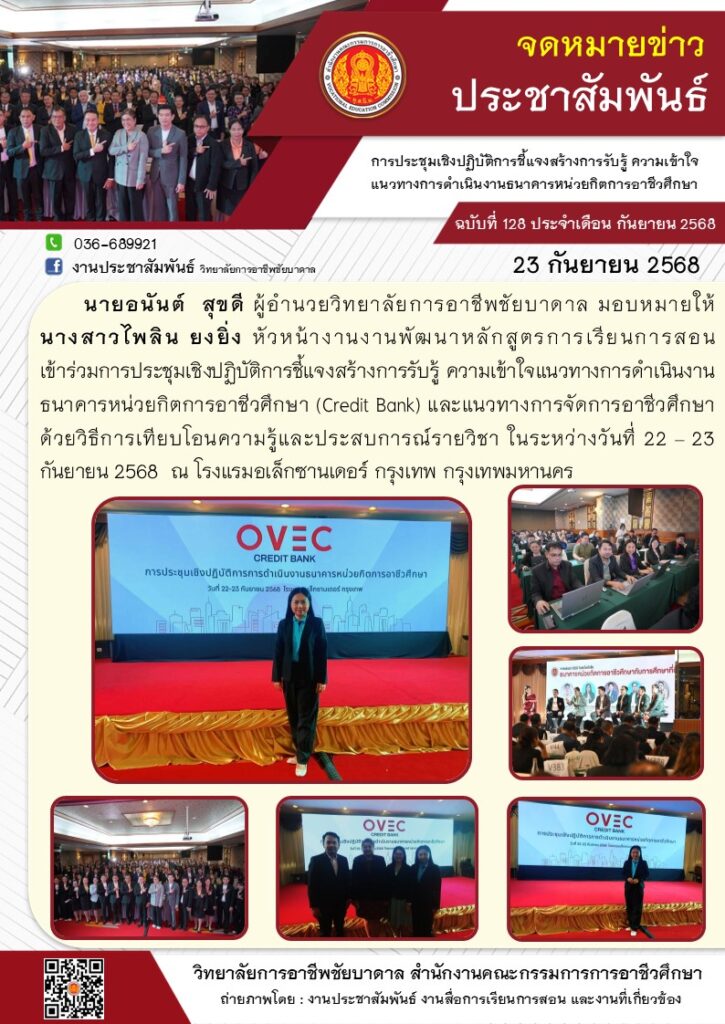 นางสาวไพลิน ยงยิ่ง หัวหน้างานงานพัฒนาหลักสูตรการเรียนการสอน เข้าร่วมการประชุมเชิงปฏิบัติการชี้แจงสร้างการรับรู้ ความเข้าใจแนวทางการดำเนินงานธนาคารหน่วยกิตการอาชีวศึกษา (Credit Bank) ในระหว่างวันที่ 22 – 23 กันยายน 2568 ณ โรงแรมอเล็กซานเดอร์ กรุงเทพ กรุงเทพมหานคร