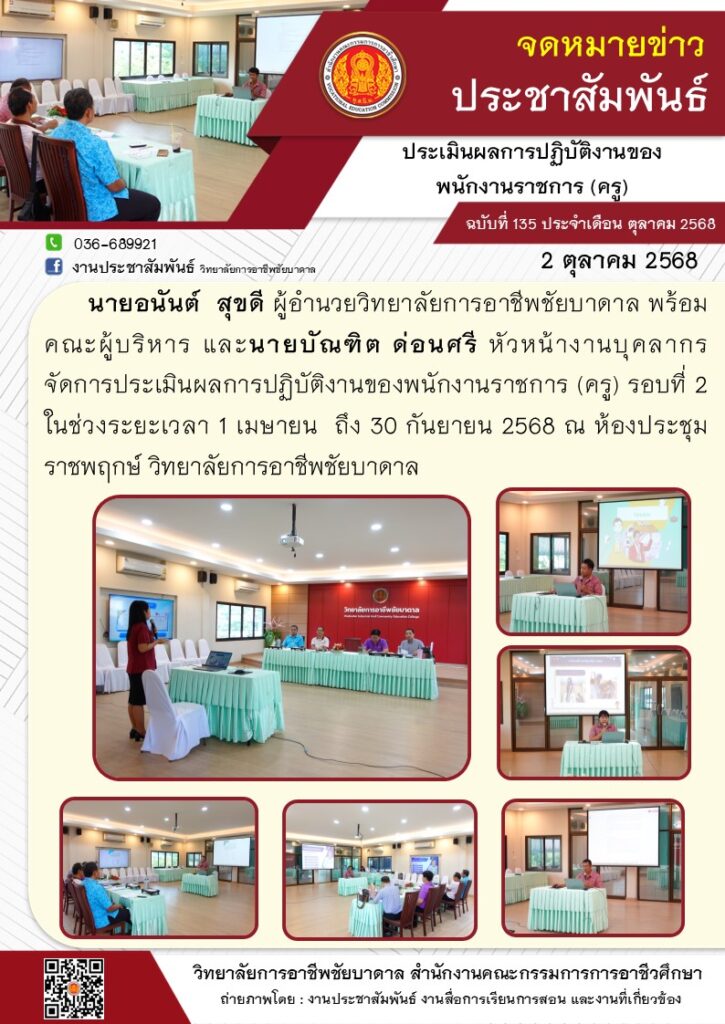งานบุคลากร วิทยาลัยการอาชีพชัยบาดาล จัดการประเมินผลการปฏิบัติงานของพนักงานราชการ (ครู) รอบที่ 2 ในช่วงระยะเวลา 1 เมษายน ถึง 30 กันยายน 2568 ณ ห้องประชุมราชพฤกษ์ วิทยาลัยการอาชีพชัยบาดาล