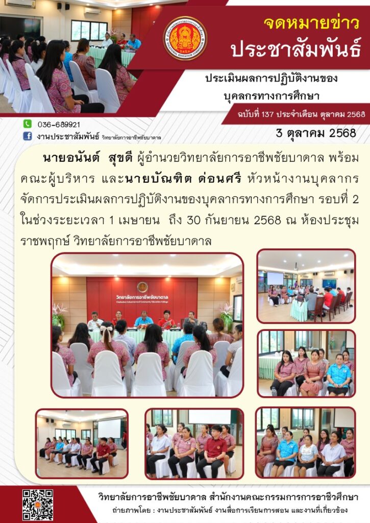 งานบุคลากร วิทยาลัยการอาชีพชัยบาดาล จัดการประเมินผลการปฏิบัติงานของบุคลากรทางการศึกษา รอบที่ 2 ในช่วงระยะเวลา 1 เมษายน ถึง 30 กันยายน 2568 ณ ห้องประชุมราชพฤกษ์ วิทยาลัยการอาชีพชัยบาดาล