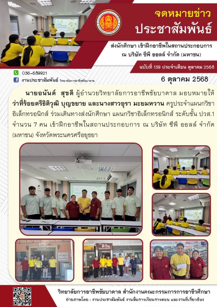 ว่าที่ร้อยตรีธิติวุฒิ บุญขยาย และนางสาวอุรา มะยมหวาน ครูประจำแผนกวิชาอิเล็กทรอนิกส์ ร่วมเดินทางส่งนักศึกษา แผนกวิชาอิเล็กทรอนิกส์ ระดับชั้น ปวส.1 จำนวน 7 คน เข้าฝึกอาชีพในสถานประกอบการ ณ บริษัท ซีพี ออลล์ จำกัด (มหาชน) จังหวัดพระนครศรีอยุธยา