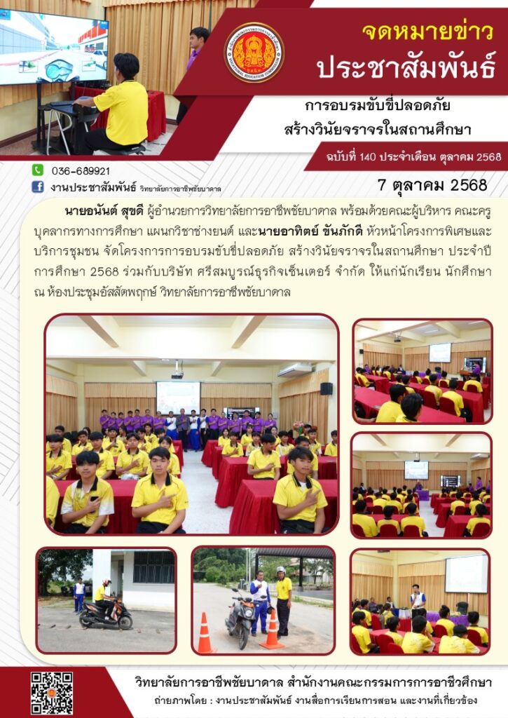 โครงการพิเศษและบริการชุมชน วิทยาลัยการอาชีพชัยบาดาล จัดโครงการการอบรมขับขี่ปลอดภัย สร้างวินัยจราจรในสถานศึกษา ประจำปีการศึกษา 2568 ร่วมกับบริษัท ศรีสมบูรณ์ธุรกิจเซ็นเตอร์ จำกัด ให้แก่นักเรียน นักศึกษา ณ ห้องประชุมอัสสัตพฤกษ์ วิทยาลัยการอาชีพชัยบาดาล