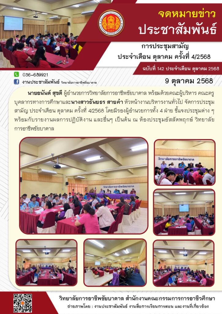 นายอนันต์ สุขดี ผู้อำนวยการวิทยาลัยการอาชีพชัยบาดาล พร้อมด้วยคณะผู้บริหาร คณะครูบุคลากรทางการศึกษา และนางสาวธันยธร สายคำ หัวหน้างานบริหารงานทั่วไป จัดประชุมสามัญประจำเดือน ตุลาคม ครั้งที่ 4/2568 ณ ห้องประชุมอัสสัตพฤกษ์ วิทยาลัยการอาชีพชัยบาดาล