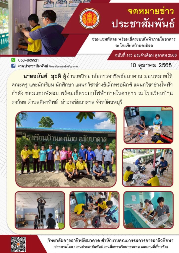 นายอนันต์ สุขดี ผู้อำนวยวิทยาลัยการอาชีพชัยบาดาล มอบหมายให้คณะครู และนักเรียน นักศึกษา แผนกวิชาช่างอิเล็กทรอนิกส์ แผนกวิชาช่างไฟฟ้ากำลัง ซ่อมแซมพัดลม พร้อมเช็คระบบไฟฟ้าภายในอาคาร ณ โรงเรียนบ้านดงน้อย ตำบลศิลาทิพย์ อำเภอชัยบาดาล จังหวัดลพบุรี