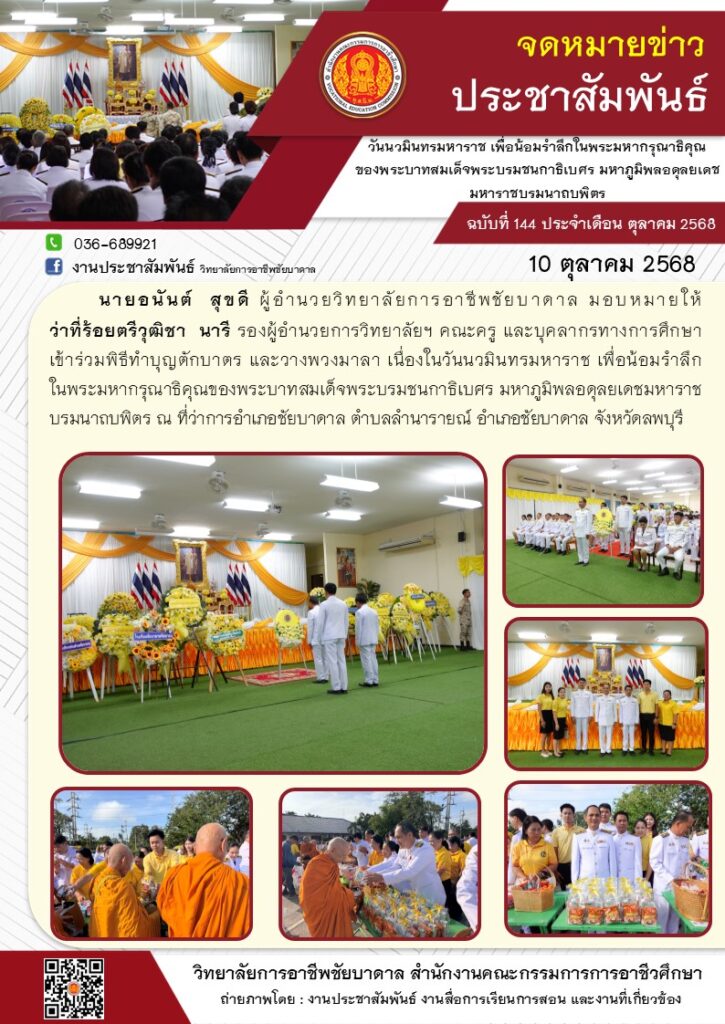 วิทยาลัยการอาชีพชัยบาดาล ร่วมพิธีทำบุญตักบาตร และวางพวงมาลา เนื่องในวันนวมินทรมหาราช เพื่อน้อมรำลึกในพระมหากรุณาธิคุณของพระบาทสมเด็จพระบรมชนกาธิเบศร มหาภูมิพลอดุลยเดชมหาราช บรมนาถบพิตร ณ ที่ว่าการอำเภอชัยบาดาล ตำบลลำนารายณ์ อำเภอชัยบาดาล จังหวัดลพบุรี