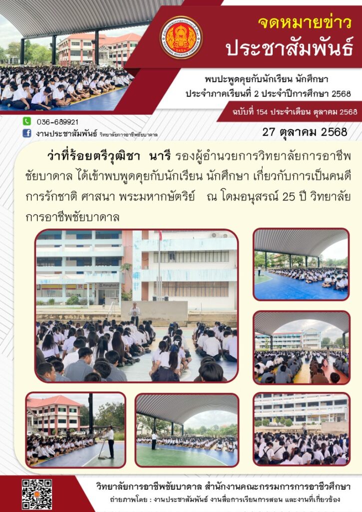 ว่าที่ร้อยตรีวุฒิชา นารี รองผู้อำนวยการวิทยาลัยการอาชีพชัยบาดาล ได้เข้าพบพูดคุยกับนักเรียน นักศึกษา เกี่ยวกับการเป็นคนดี การรักชาติ ศาสนา พระมหากษัตริย์