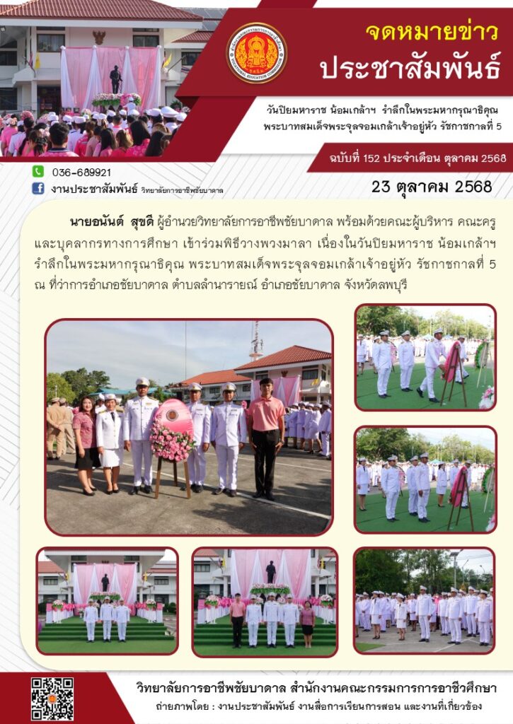 นายอนันต์ สุขดี ผู้อำนวยวิทยาลัยการอาชีพชัยบาดาล พร้อมด้วยคณะผู้บริหาร คณะครู และบุคลากรทางการศึกษา เข้าร่วมพิธีวางพวงมาลา เนื่องในวันปิยมหาราช น้อมเกล้าฯ รำลึกในพระมหากรุณาธิคุณ พระบาทสมเด็จพระจุลจอมเกล้าเจ้าอยู่หัว รัชกาชกาลที่ 5 ณ ที่ว่าการอำเภอชัยบาดาล ตำบลลำนารายณ์ อำเภอชัยบาดาล จังหวัดลพบุรี