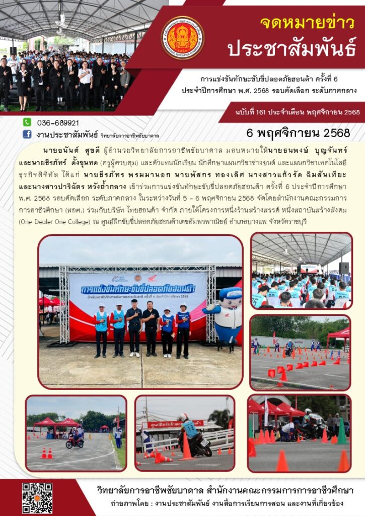 วิทยาลัยการอาชีพชัยบาดาล ส่งตัวแทนนักเรียน นักศึกษา เข้าร่วมการแข่งขันทักษะขับขี่ปลอดภัยฮอนด้า ครั้งที่ 6 ประจำปีการศึกษา พ.ศ. 2568 รอบคัดเลือก ระดับภาคกลาง ในระหว่างวันที่ 5 – 6 พฤศจิกายน 2568 ณ ศูนย์ฝึกขับขี่ปลอดภัยฮอนด้าเตชอัมพรพาณิชย์ อำเภอบางแพ จังหวัดราชบุรี