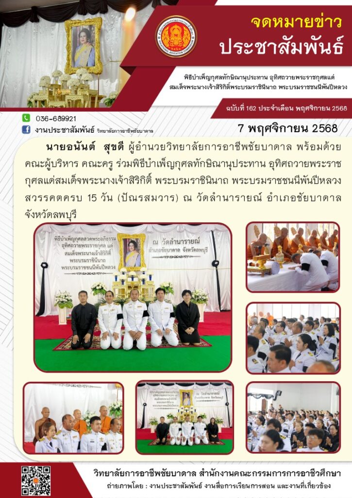 นายอนันต์ สุขดี ผู้อำนวยวิทยาลัยการอาชีพชัยบาดาล พร้อมด้วยคณะผู้บริหาร คณะครู ร่วมพิธีบำเพ็ญกุศลทักษิณานุประทาน อุทิศถวายพระราชกุศลแด่สมเด็จพระนางเจ้าสิริกิติ์ พระบรมราชินินาถ พระบรมราชชนนีพันปีหลวง สวรรคตครบ 15 วัน (ปัณรสมวาร) ณ วัดลำนารายณ์ อำเภอชัยบาดาล จังหวัดลพบุรี