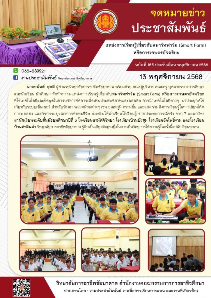 วิทยาลัยการอาชีพชัยบาดาล จัดกิจกรรมแหล่งการเรียนรู้เกี่ยวกับสมาร์ทฟาร์ม (Smart Farm) หรือการเกษตรอัจฉริยะ และกิจกรรมบูรณาการทักษะชีวิต ส่งเสริมให้นักเรียนได้เรียนรู้ จากประสบการณ์จริง จาก 7 แผนกวิชา และการนำเทคโนโลยีต่างๆ มาประยุกต์ใช้เกี่ยวกับระบบเซ็นเซอร์ สำหรับวัดสภาพแวดล้อมต่างๆ รวมถึงการเรียนรู้ในการเขียนโค้ด การทดลอง สำหรับนักเรียนระดับชั้นมัธยมศึกษาปีที่ 3
