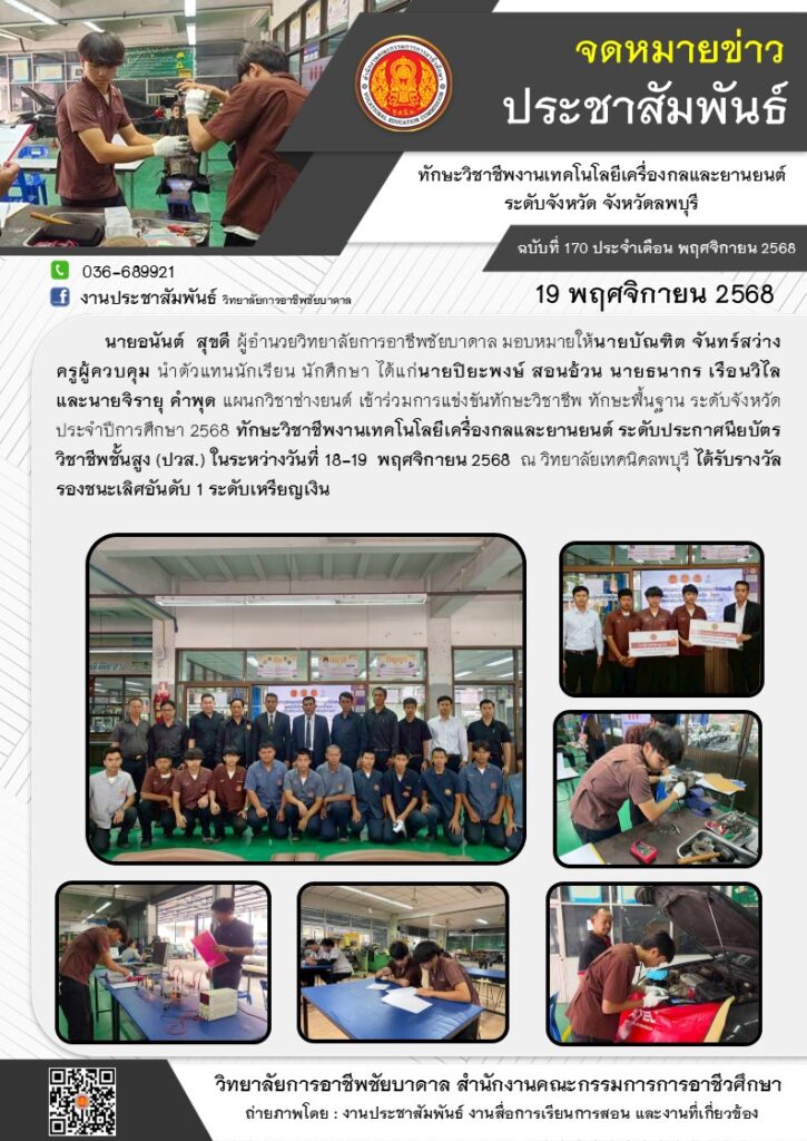 วิทยาลัยการอาชีพชัยบาดาล นำตัวแทนนักเรียน นักศึกษา แผนกวิชาช่างยนต์ เข้าร่วมการแข่งขันทักษะวิชาชีพ ทักษะพื้นฐาน ระดับจังหวัด ประจำปีการศึกษา 2568 ทักษะวิชาชีพงานเทคโนโลยีเครื่องกลและยานยนต์ ระดับประกาศนียบัตรวิชาชีพชั้นสูง (ปวส.) ในระหว่างวันที่ 18-19 พฤศจิกายน 2568 ณ วิทยาลัยเทคนิคลพบุรี ได้รับรางวัลรองชนะเลิศอันดับ 1