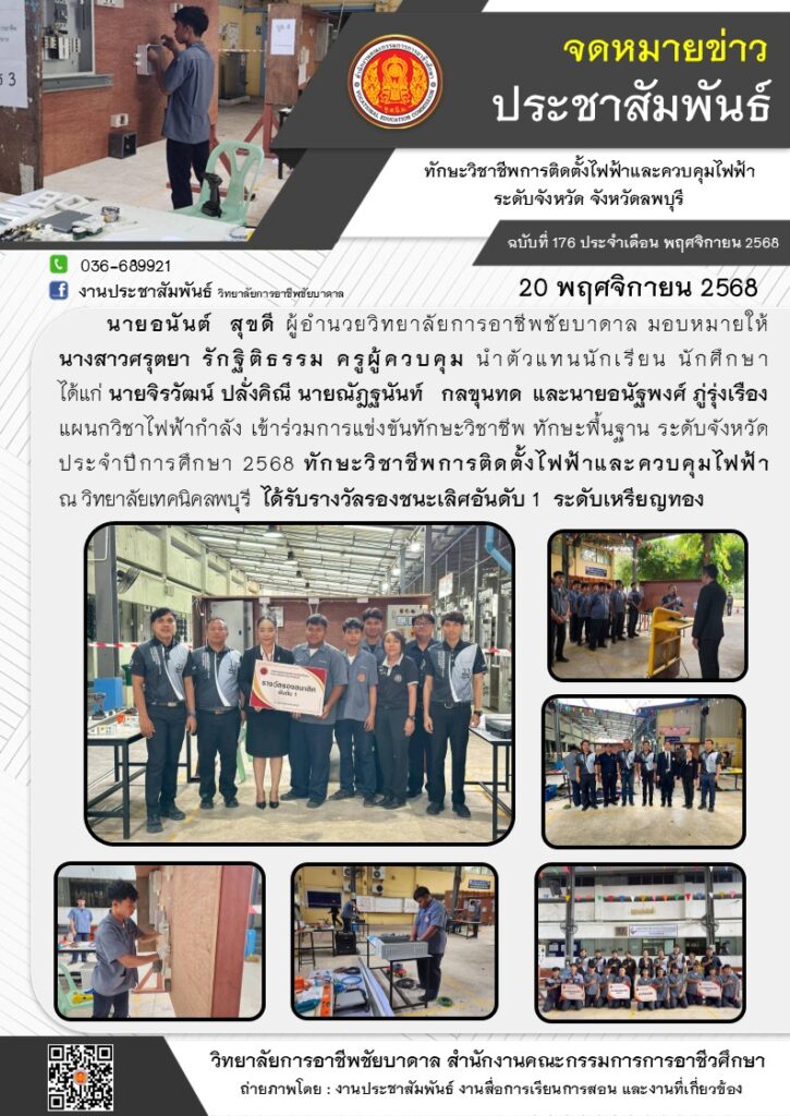 วิทยาลัยการอาชีพชัยบาดาล นำตัวแทนนักเรียน นักศึกษา แผนกวิชาไฟฟ้ากำลัง เข้าร่วมการแข่งขันทักษะวิชาชีพ ทักษะพื้นฐาน ระดับจังหวัด ประจำปีการศึกษา 2568 ทักษะวิชาชีพการติดตั้งไฟฟ้าและควบคุมไฟฟ้า ณ วิทยาลัยเทคนิคลพบุรี ได้รับรางวัลรองชนะเลิศอันดับ 1 ระดับเหรียญทอง