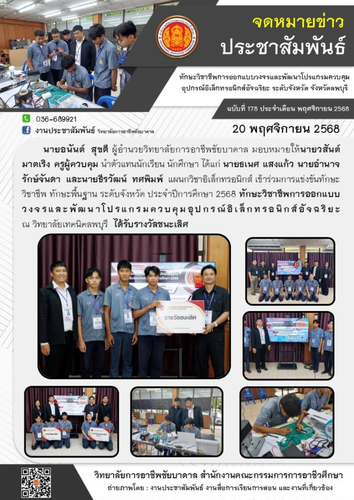 วิทยาลัยการอาชีพชัยบาดาล นำตัวแทนนักเรียน นักศึกษา แผนกวิชาอิเล็กทรอนิกส์ เข้าร่วมการแข่งขันทักษะวิชาชีพ ทักษะพื้นฐาน ระดับจังหวัด ประจำปีการศึกษา 2568 ทักษะวิชาชีพการออกแบบวงจรและพัฒนาโปรแกรมควบคุมอุปกรณ์อิเล็กทรอนิกส์อัจฉริยะ ณ วิทยาลัยเทคนิคลพบุรี ได้รับรางวัลชนะเลิศ