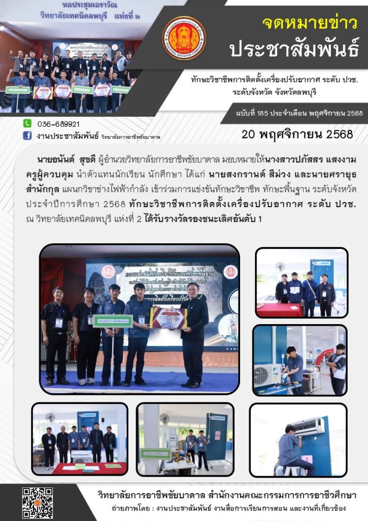วิทยาลัยการอาชีพชัยบาดาล นำตัวแทนนักเรียน นักศึกษา แผนกวิชาช่างไฟฟ้ากำลัง เข้าร่วมการแข่งขันทักษะวิชาชีพ ทักษะพื้นฐาน ระดับจังหวัด ประจำปีการศึกษา 2568 ทักษะวิชาชีพการติดตั้งเครื่องปรับอากาศ ระดับ ปวช. ณ วิทยาลัยเทคนิคลพบุรี แห่งที่ 2 ได้รับรางวัลรองชนะเลิศอันดับ
