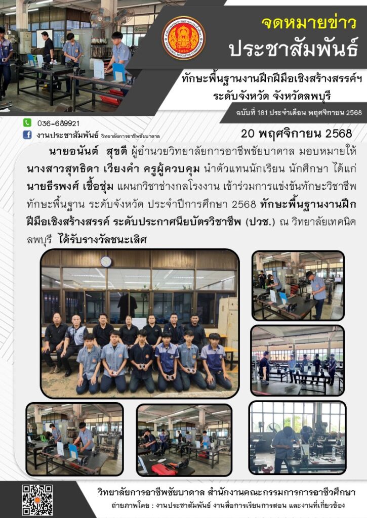 วิทยาลัยการอาชีพชัยบาดาล นำตัวแทนนักเรียน นักศึกษา แผนกวิชาช่างกลโรงงาน เข้าร่วมการแข่งขันทักษะวิชาชีพ ทักษะพื้นฐาน ระดับจังหวัด ประจำปีการศึกษา 2568 ทักษะพื้นฐานงานฝึกฝีมือเชิงสร้างสรรค์ ระดับประกาศนียบัตรวิชาชีพ (ปวช.) ณ วิทยาลัยเทคนิคลพบุรี ได้รับรางวัลชนะเลิศ