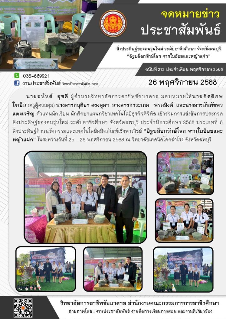 นายกิตติภพ ใจเย็น (ครูผู้ควบคุม) นางสาวกฤติยา ดวงสุดา นางสาวการะเกด พรมสิงห์ และนางสาวนันทัชพร แตงเจริญ ตัวแทนนักเรียน นักศึกษาแผนกวิชาเทคโนโลยีธุรกิจดิจิทัล เข้าร่วมการแข่งขันการประกวดสิ่งประดิษฐ์ของคนรุ่นใหม่ ระดับอาชีวศึกษา จังหวัดลพบุรี ประจำปีการศึกษา 2568 “อิฐบล็อกรักษ์โลก จากใบอ้อยและหญ้าแฝก” ณ วิทยาลัยเทคนิคโคกสำโรง จังหวัดลพบุรี