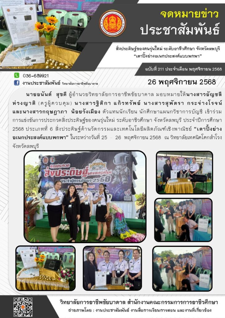 นางสาวอัญชลี ห่วงญาติ (ครูผู้ควบคุม) นางสาวฐิติกา แก้วทรัพย์ นางสาวสุพัตรา กระจ่างโรจน์ และนางสาวกฤษฎาภา น้อยวังเมือง ตัวแทนนักเรียน นักศึกษาแผนกวิชาการบัญชี เข้าร่วมการแข่งขันการประกวดสิ่งประดิษฐ์ของคนรุ่นใหม่ ระดับอาชีวศึกษา จังหวัดลพบุรี ประจำปีการศึกษา 2568 “เตาปิ้งย่างอเนกประสงค์แบบพกพา” ณ วิทยาลัยเทคนิคโคกสำโรง จังหวัดลพบุรี