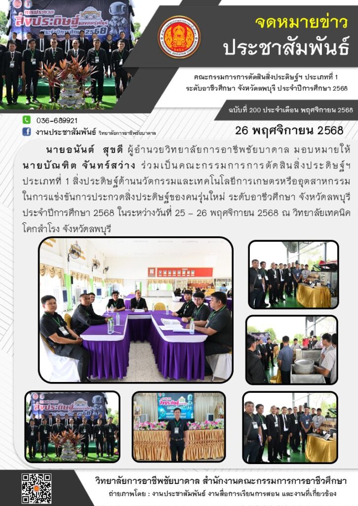 นายบัณฑิต จันทร์สว่าง ร่วมเป็นคณะกรรมการการตัดสินสิ่งประดิษฐ์ฯ ประเภทที่ 1 สิ่งประดิษฐ์ด้านนวัตกรรมและเทคโนโลยีการเกษตรหรืออุตสาหกรรม ในการแข่งขันการประกวดสิ่งประดิษฐ์ของคนรุ่นใหม่ ระดับอาชีวศึกษา จังหวัดลพบุรี ประจำปีการศึกษา 2568 ณ วิทยาลัยเทคนิคโคกสำโรง จังหวัดลพบุรี