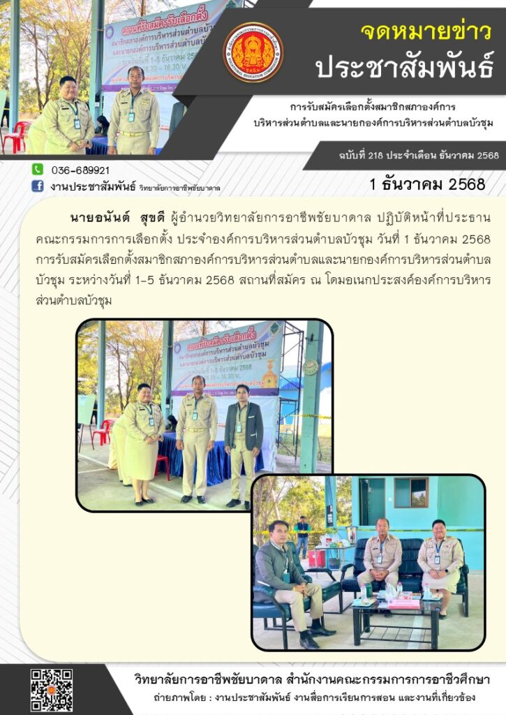 นายอนันต์ สุขดี ผู้อำนวยวิทยาลัยการอาชีพชัยบาดาล ปฏิบัติหน้าที่ประธานคณะกรรมการการเลือกตั้ง ประจำองค์การบริหารส่วนตำบลบัวชุม การรับสมัครเลือกตั้งสมาชิกสภาองค์การบริหารส่วนตำบลและนายกองค์การบริหารส่วนตำบลบัวชุม สถานที่สมัคร ณ โดมอเนกประสงค์องค์การบริหารส่วนตำบลบัวชุม