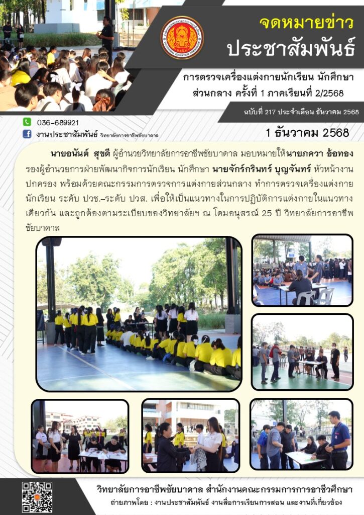 งานปกครอง พร้อมด้วยคณะกรรมการตรวจการแต่งกายส่วนกลาง ทำการตรวจเครื่องแต่งกายนักเรียน ระดับ ปวช.–ระดับ ปวส. เพื่อให้เป็นแนวทางในการปฏิบัติการแต่งกายในแนวทางเดียวกัน และถูกต้องตามระเบียบของวิทยาลัยฯ ณ โดมอนุสรณ์ 25 ปี วิทยาลัยการอาชีพชัยบาดาล