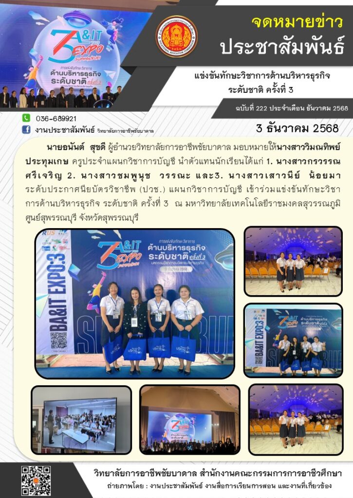 นางสาววิมณทิพย์ ประทุมเกษ นำตัวแทนนักเรียน ระดับประกาศนียบัตรวิชาชีพ (ปวช.) แผนกวิชาการบัญชี เข้าร่วมแข่งขันทักษะวิชาการด้านบริหารธุรกิจ ระดับชาติ ครั้งที่ 3 ณ มหาวิทยาลัยเทคโนโลยีราชมงคลสุวรรณภูมิศูนย์สุพรรณบุรี จังหวัดสุพรรณบุรี