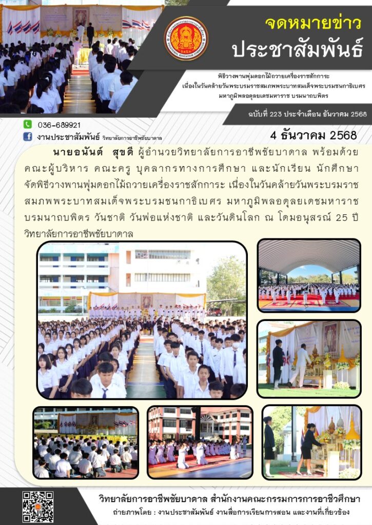 วิทยาลัยการอาชีพชัยบาดาล จัดพิธีวางพานพุ่มดอกไม้ถวายเครื่องราชสักการะ เนื่องในวันคล้ายวันพระบรมราชสมภพพระบาทสมเด็จพระบรมชนกาธิเบศร มหาภูมิพลอดุลยเดชมหาราช บรมนาถบพิตร วันชาติ วันพ่อแห่งชาติ และวันดินโลก ณ โดมอนุสรณ์ 25 ปี วิทยาลัยการอาชีพชัยบาดาล