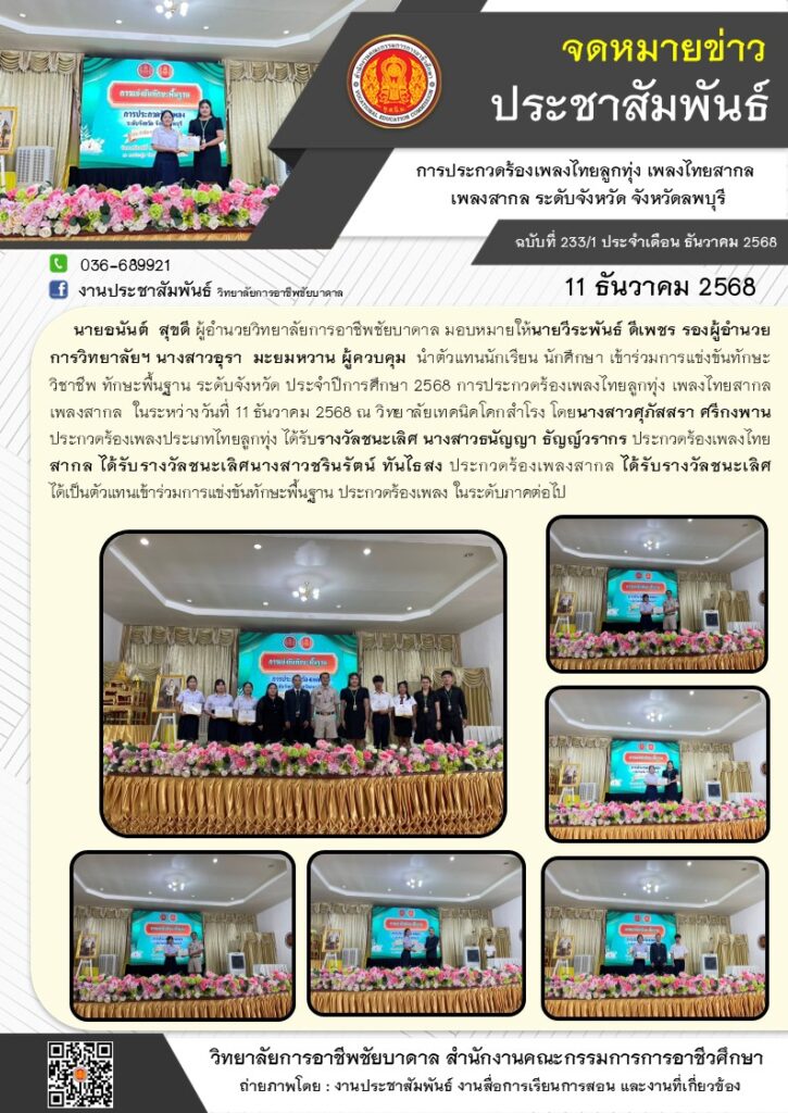 วิทยาลัยการอาชีพชัยบาดาล นำตัวแทนนักเรียน เข้าร่วมการแข่งขันทักษะวิชาชีพ ทักษะพื้นฐาน ระดับจังหวัด ประจำปีการศึกษา 2568 การประกวดร้องเพลงไทยลูกทุ่ง เพลงไทยสากล เพลงสากล ในระหว่างวันที่ 11 ธันวาคม 2568 ณ วิทยาลัยเทคนิคโคกสำโรง