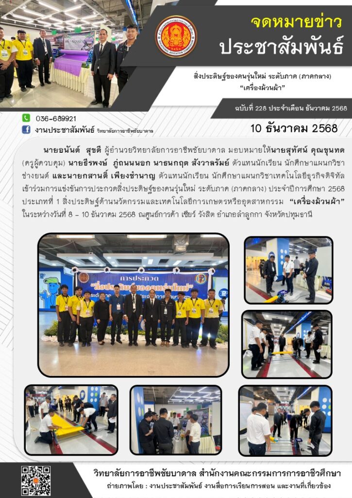วิทยาลัยการอาชีพชัยบาดาล เข้าร่วมการแข่งขันการประกวดสิ่งประดิษฐ์ของคนรุ่นใหม่ ระดับภาค (ภาคกลาง) ประจำปีการศึกษา 2568 ประเภทที่ 1 สิ่งประดิษฐ์ด้านนวัตกรรมและเทคโนโลยีการเกษตรหรืออุตสาหกรรม “เครื่องม้วนผ้า” ในระหว่างวันที่ 8 – 10 ธันวาคม 2568 ณศูนย์การค้า เซียร์ รังสิต อำเภอลำลูกกา จังหวัดปทุมธานี
