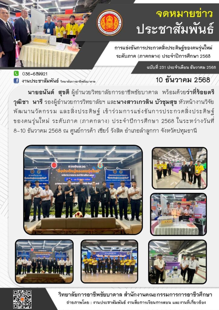 นายอนันต์ สุขดี ผู้อำนวยวิทยาลัยการอาชีพชัยบาดาล พร้อมด้วยว่าที่ร้อยตรีวุฒิชา นารี รองผู้อำนวยการวิทยาลัยฯ และนางสาวเกวลิน บัวชุมสุข หัวหน้างานวิจัย พัฒนานวัตกรรม และสิ่งประดิษฐ์ เข้าร่วมการแข่งขันการประกวดสิ่งประดิษฐ์ ของคนรุ่นใหม่ ระดับภาค (ภาคกลาง) ประจำปีการศึกษา 2568 ณ ศูนย์การค้า เซียร์ รังสิต อำเภอลำลูกกา จังหวัดปทุมธานี