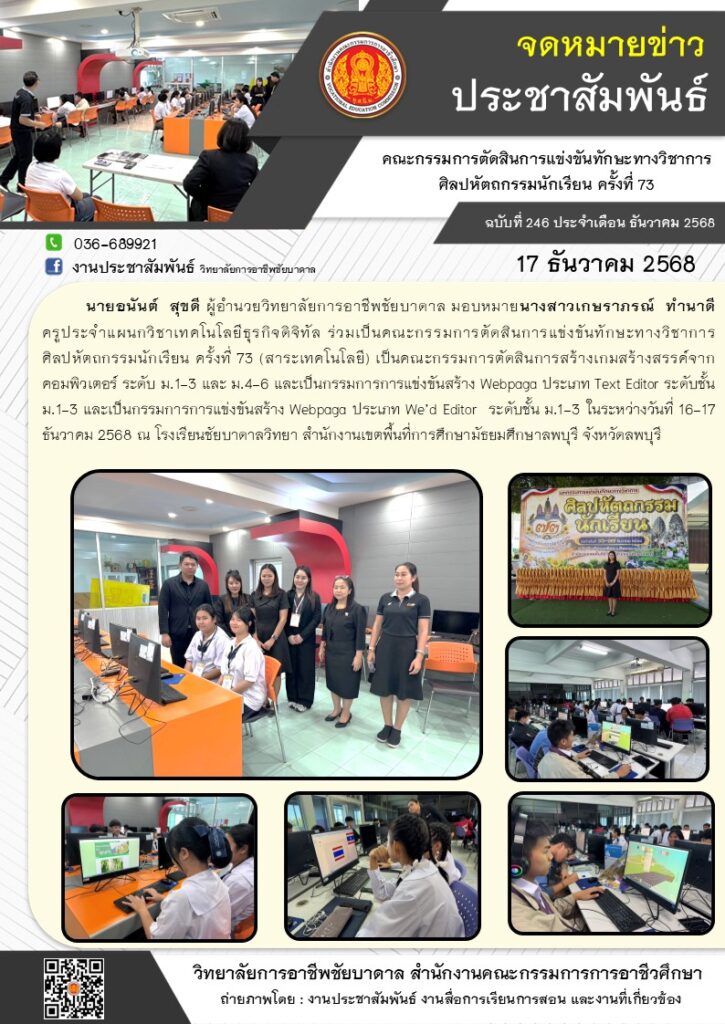 นางสาวเกษราภรณ์ ทำนาดี ครูประจำแผนกวิชาเทคโนโลยีธุรกิจดิจิทัล ร่วมเป็นคณะกรรมการตัดสินการแข่งขันทักษะทางวิชาการ ศิลปหัตถกรรมนักเรียน ครั้งที่ 73 (สาระเทคโนโลยี) ในระหว่างวันที่ 16-17 ธันวาคม 2568 ณ โรงเรียนชัยบาดาลวิทยา สำนักงานเขตพื้นที่การศึกษามัธยมศึกษาลพบุรี จังหวัดลพบุรี