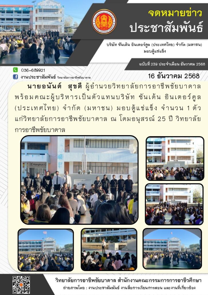 บริษัท ซันเด้น อินเตอร์คูล (ประเทศไทย) จำกัด (มหาชน) มอบตู้แช่แข็ง จำนวน 1 ตัว แก่วิทยาลัยการอาชีพชัยบาดาล ณ โดมอนุสรณ์ 25 ปี วิทยาลัยการอาชีพชัยบาดาล