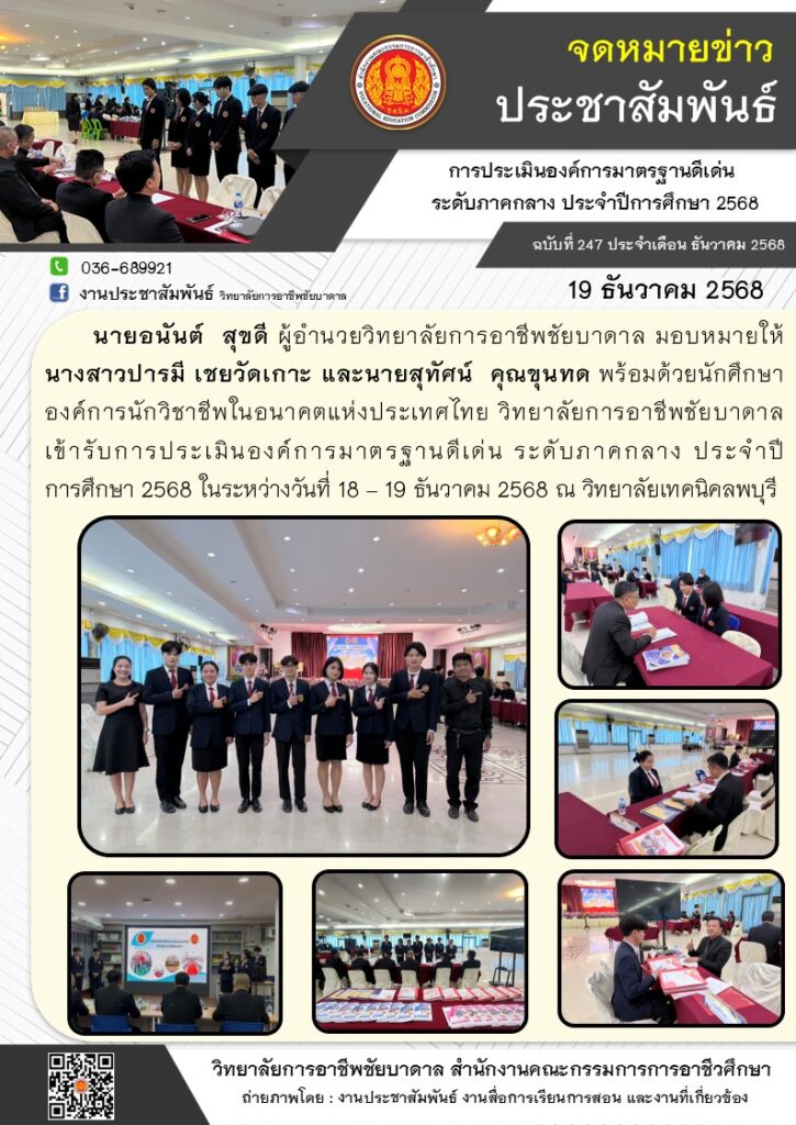นางสาวปารมี เชยวัดเกาะ และนายสุทัศน์ คุณขุนทด พร้อมด้วยนักศึกษาองค์การนักวิชาชีพในอนาคตแห่งประเทศไทย วิทยาลัยการอาชีพชัยบาดาล เข้ารับการประเมินองค์การมาตรฐานดีเด่น ระดับภาคกลาง ประจำปีการศึกษา 2568 ในระหว่างวันที่ 18 – 19 ธันวาคม 2568 ณ วิทยาลัยเทคนิคลพบุรี