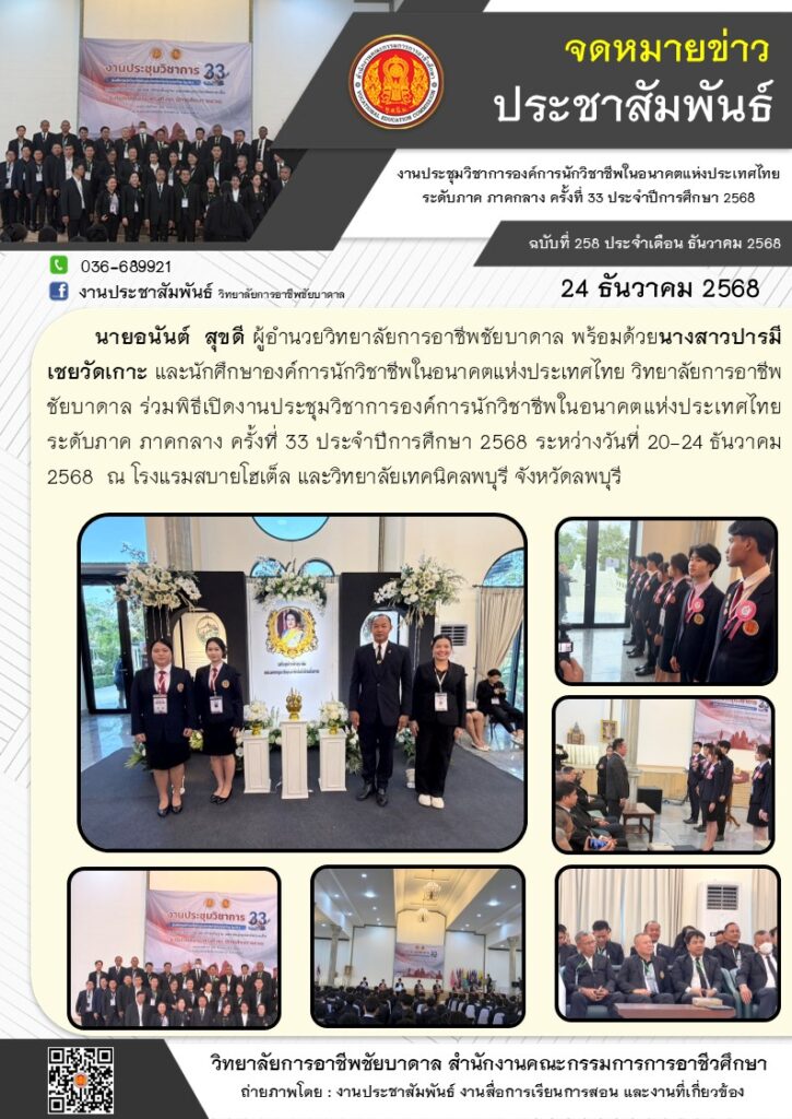 นายอนันต์ สุขดี ผู้อำนวยวิทยาลัยการอาชีพชัยบาดาล พร้อมด้วยนางสาวปารมี เชยวัดเกาะ และนักศึกษาองค์การนักวิชาชีพในอนาคตแห่งประเทศไทย วิทยาลัยการอาชีพชัยบาดาล ร่วมพิธีเปิดงานประชุมวิชาการองค์การนักวิชาชีพในอนาคตแห่งประเทศไทย ระดับภาค ภาคกลาง ครั้งที่ 33 ประจำปีการศึกษา 2568 ณ โรงแรมสบายโฮเต็ล และวิทยาลัยเทคนิคลพบุรี จังหวัดลพบุรี