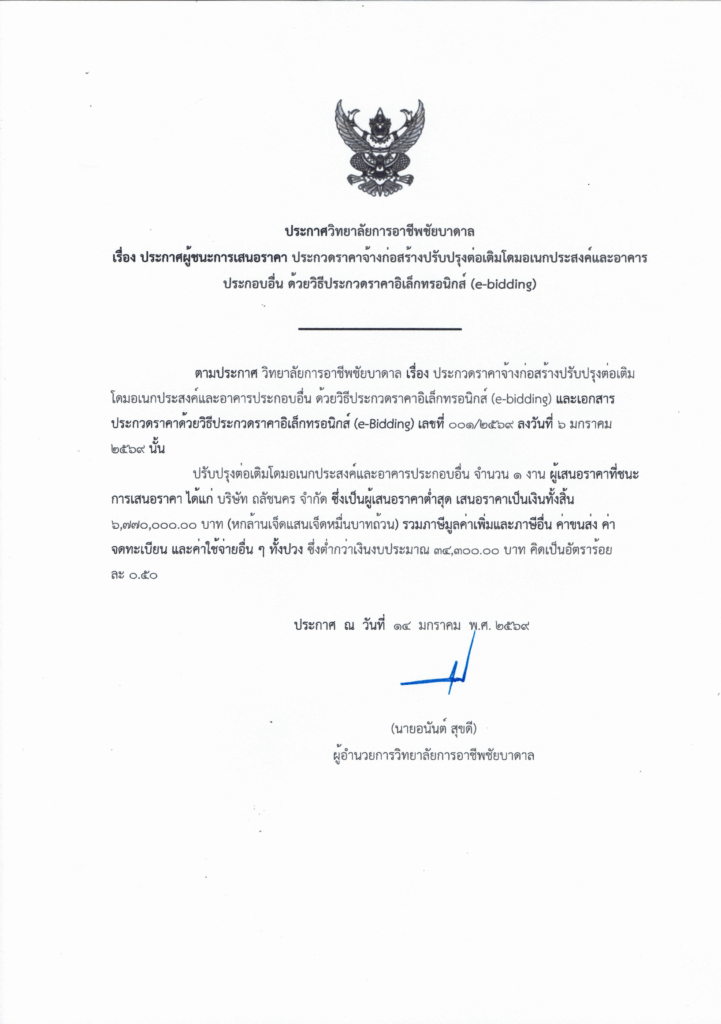 ข่าวจัดซื้อจัดจ้าง ประกาศวิทยาลัยการอาชีพชัยบาดาลเรื่อง ประกาศผู้ชนะการเสนอราคา ประกวดราคาจ้างก่อสร้างปรับปรุงต่อเติมโดมอเนกประสงค์และอาคารประกอบอื่น ด้วยวิธีประกวดราคาอิเล็กทรอนิกส์ (e-bidding) chaibadan 14 มกราคม 2026 Post navigation Previous Previous post: ประกาศวิทยาลัยการอาชีพชัยบาดาล เรื่อง ประกวดราคาจ้างก่อสร้างปรับปรุงต่อเติมโดมอเนกประสงค์และอาคารประกอบอื่นด้วยวิธีประกวดราคาอิเล็กทรอนิกส์ (e-bidding) ใส่ความเห็น ยกเลิกการตอบอีเมลของคุณจะไม่แสดงให้คนอื่นเห็น ช่องข้อมูลจำเป็นถูกทำเครื่องหมาย *ความเห็น * ชื่อ * อีเมล * เว็บไซต์ บันทึกชื่อ, อีเมล และชื่อเว็บไซต์ของฉันบนเบราว์เซอร์นี้ สำหรับการแสดงความเห็นครั้งถัดไป Δ Related News ข่าวจัดซื้อจัดจ้าง ประกาศวิทยาลัยการอาชีพชัยบาดาล เรื่อง ประกวดราคาจ้างก่อสร้างปรับปรุงต่อเติมโดมอเนกประสงค์และอาคารประกอบอื่นด้วยวิธีประกวดราคาอิเล็กทรอนิกส์ (e-bidding) 6 มกราคม 2026 0 ข่าวจัดซื้อจัดจ้าง ประกาศ วิทยาลัยการอาชีพชัยบาดาล เรื่อง เผยแพร่แผนการจัดซื้อจัดจ้าง ประจำปีงบประมาณ พ.ศ. ๒๕๖๘ 25 ตุลาคม 2025 0