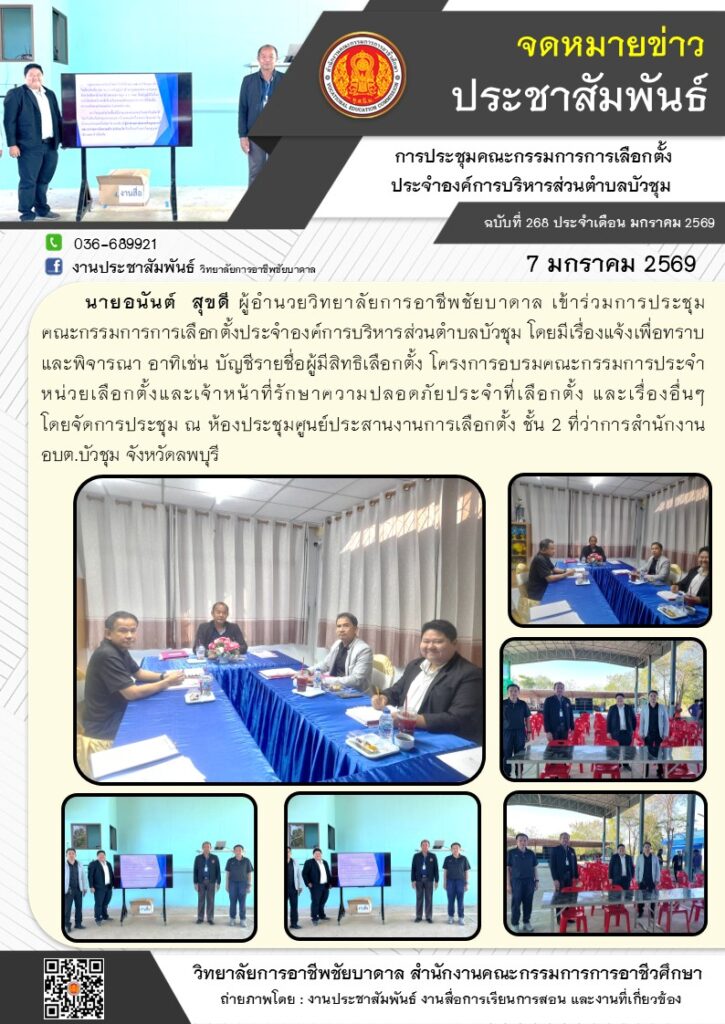 นายอนันต์ สุขดี ผู้อำนวยวิทยาลัยการอาชีพชัยบาดาล เข้าร่วมการประชุมคณะกรรมการการเลือกตั้งประจำองค์การบริหารส่วนตำบลบัวชุม โดยจัดการประชุม ณ ห้องประชุมศูนย์ประสานงานการเลือกตั้ง ชั้น 2 ที่ว่าการสำนักงาน อบต.บัวชุม จังหวัดลพบุรี