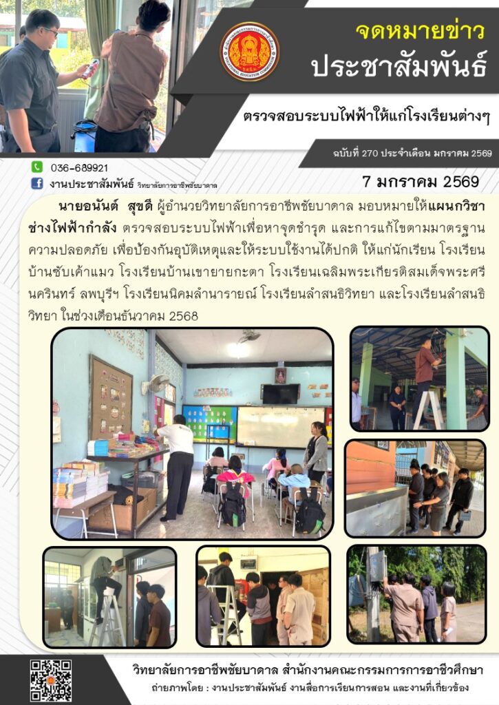 แผนกวิชาช่างไฟฟ้ากำลัง ตรวจสอบระบบไฟฟ้า เพื่อความปลอดภัยให้แก่นักเรียน โรงเรียนบ้านซับเค้าแมว โรงเรียนบ้านเขายายกะตา โรงเรียนเฉลิมพระเกียรติสมเด็จพระศรีนครินทร์ ลพบุรีฯ โรงเรียนนิคมลำนารายณ์ โรงเรียนลำสนธิวิทยา และโรงเรียนลำสนธิวิทยา ในช่วงเดือนธันวาคม 2568