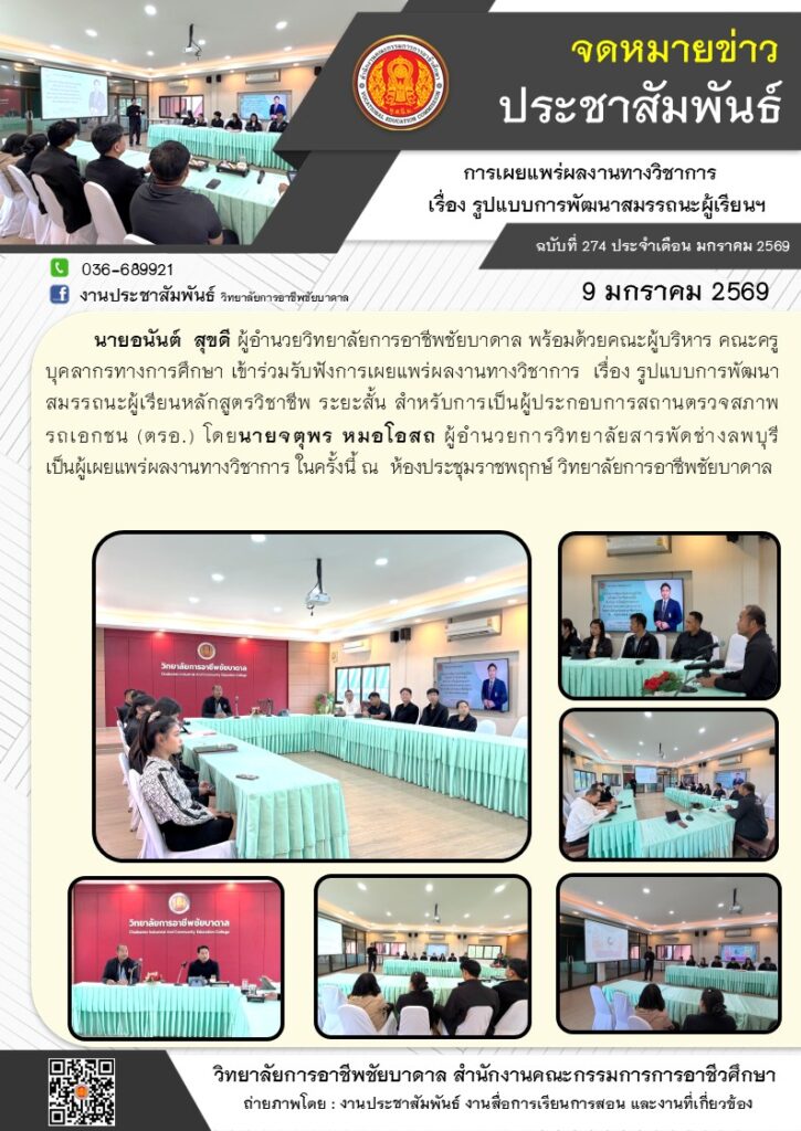 คณะผู้บริหาร คณะครู บุคลากรทางการศึกษา วิทยาลัยการอาชีพชัยบาดาลเข้าร่วมรับฟังการเผยแพร่ผลงานทางวิชาการ โดยนายจตุพร หมอโอสถ ผู้อำนวยการวิทยาลัยสารพัดช่างลพบุรี เป็นผู้เผยแพร่ผลงานทางวิชาการ ในครั้งนี้ ณ ห้องประชุมราชพฤกษ์ วิทยาลัยการอาชีพชัยบาดาล