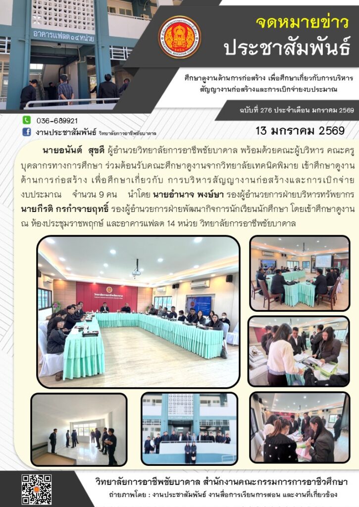 วิทยาลัยการอาชีพชัยบาดาล ร่วมต้อนรับคณะศึกษาดูงานจากวิทยาลัยเทคนิคพิมาย เข้าศึกษาดูงานด้านการก่อสร้าง เพื่อศึกษาเกี่ยวกับ การบริหารสัญญางานก่อสร้างและการเบิกจ่ายงบประมาณ โดยเข้าศึกษาดูงาน ณ ห้องประชุมราชพฤกษ์ และอาคารแฟลต 14 หน่วย วิทยาลัยการอาชีพชัยบาดาล