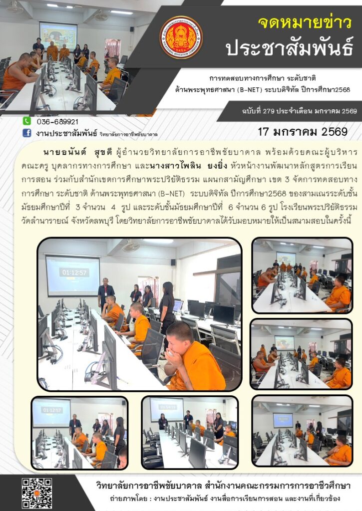 วิทยาลัยการอาชีพชัยบาดาล ร่วมกับสำนักเขตการศึกษาพระปริยัติธรรม แผนกสามัญศึกษา เขต 3 จัดการทดสอบทางการศึกษา ระดับชาติ ด้านพระพุทธศาสนา (B-NET) ระบบดิจิทัล ปีการศึกษา2568 โดยวิทยาลัยการอาชีพชัยบาดาลได้รับมอบหมายให้เป็นสนามสอบในครั้งนี้