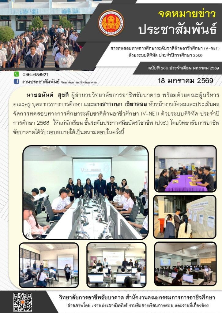 วิทยาลัยการอาชีพชัยบาดาล จัดการทดสอบทางการศึกษาระดับชาติด้านอาชีวศึกษา (V-NET) ด้วยระบบดิจิทัล ประจำปีการศึกษา 2568 ให้แก่นักเรียน ชั้นระดับประกาศนียบัตรวิชาชีพ (ปวช.) โดยวิทยาลัยการอาชีพชัยบาดาลได้รับมอบหมายให้เป็นสนามสอบในครั้งนี้