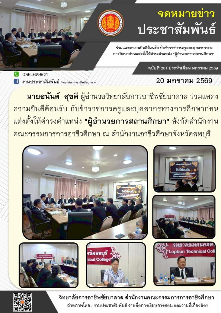 นายอนันต์ สุขดี ผู้อำนวยวิทยาลัยการอาชีพชัยบาดาล ร่วมแสดงความยินดีต้อนรับ กับข้าราชการครูและบุคลากรทางการศึกษาก่อนแต่งตั้งให้ดำรงตำแหน่ง “ผู้อำนวยการสถานศึกษา” สังกัดสำนักงานคณะกรรมการการอาชีวศึกษา ณ สำนักงานอาชีวศึกษาจังหวัดลพบุรี