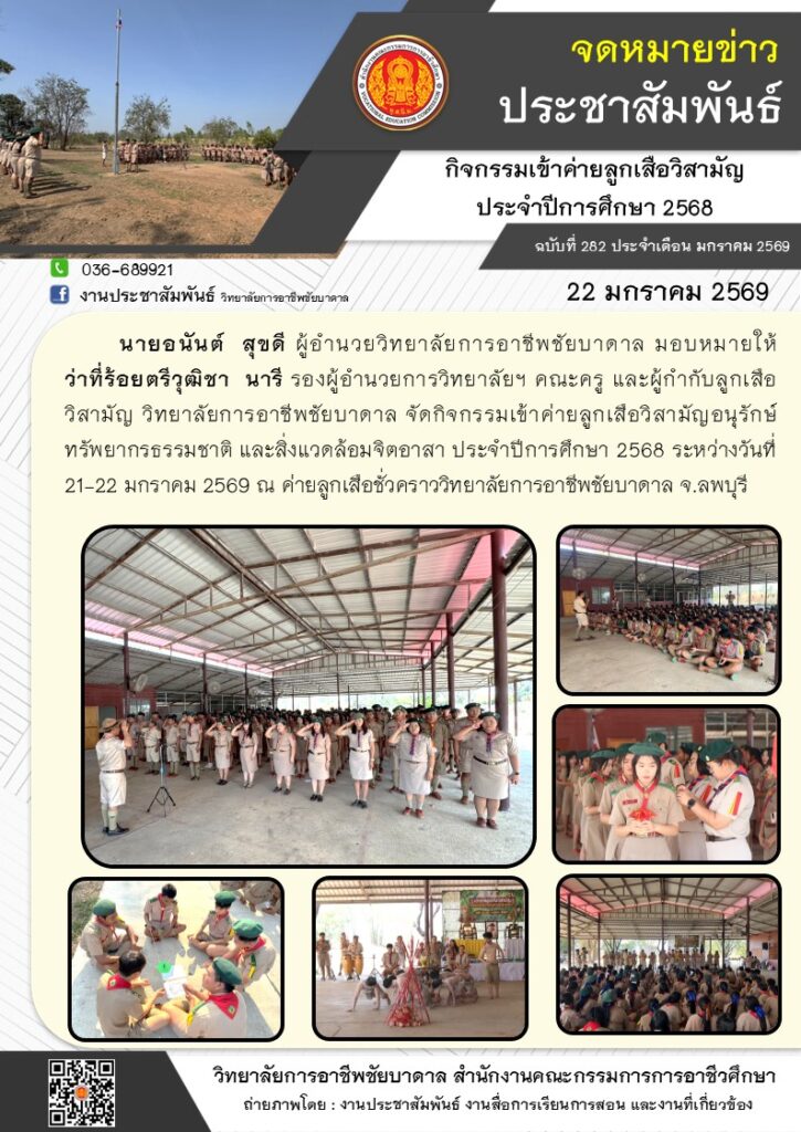 กองลูกเสือวิสามัญ วิทยาลัยการอาชีพชัยบาดาล จัดกิจกรรมเข้าค่ายลูกเสือวิสามัญอนุรักษ์ทรัพยากรธรรมชาติ และสิ่งแวดล้อมจิตอาสา ประจำปีการศึกษา 2568 ระหว่างวันที่ 21-22 มกราคม 2569 ณ ค่ายลูกเสือชั่วคราววิทยาลัยการอาชีพชัยบาดาล จ.ลพบุรี