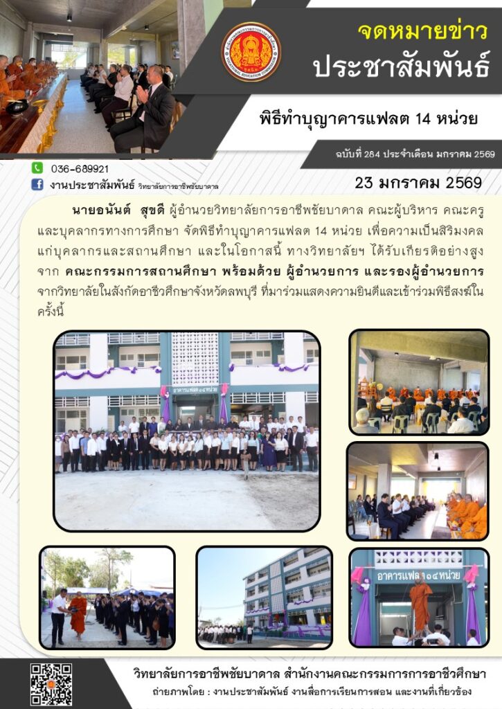 วิทยาลัยการอาชีพชัยบาดาล จัดพิธีทำบุญาคารแฟลต 14 หน่วย เพื่อความเป็นสิริมงคล แก่บุคลากรและสถานศึกษา และในโอกาสนี้ ทางวิทยาลัยฯ ได้รับเกียรติอย่างสูง จากคณะกรรมการสถานศึกษา พร้อมด้วย ผู้อำนวยการ และรองผู้อำนวยการจากวิทยาลัยในสังกัดอาชีวศึกษาจังหวัดลพบุรี ที่มาร่วมแสดงความยินดีและเข้าร่วมพิธีสงฆ์ในครั้งนี้