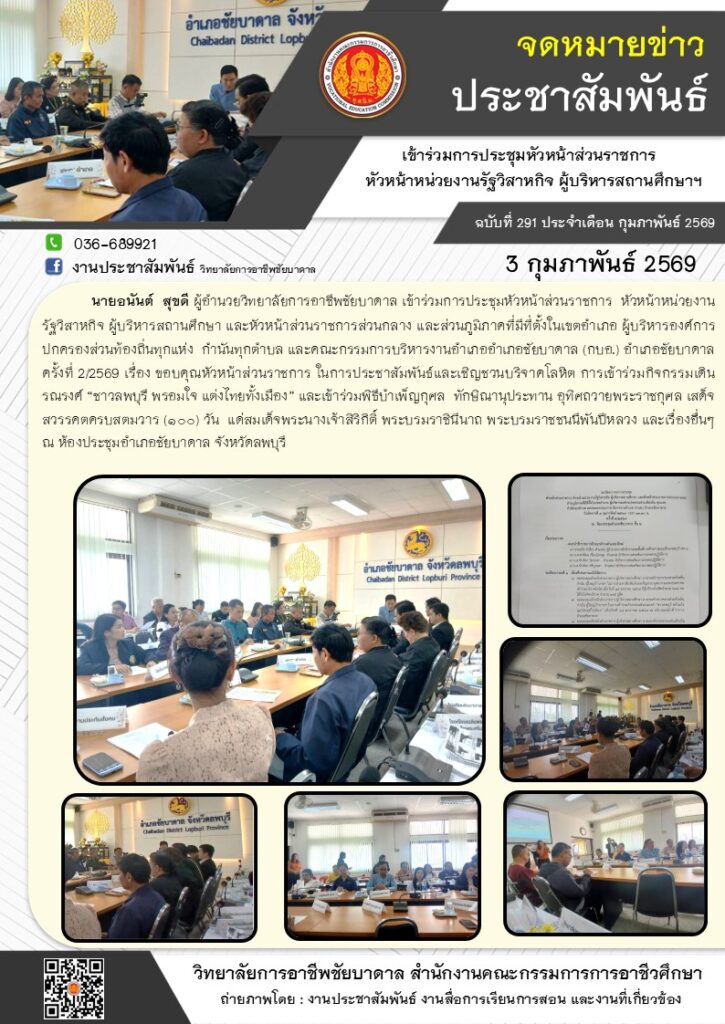 นายอนันต์ สุขดี ผู้อำนวยวิทยาลัยการอาชีพชัยบาดาล เข้าร่วมการประชุมหัวหน้าส่วนราชการฯ ครั้งที่ 2/2569 ณ ห้องประชุมอำเภอชัยบาดาล จังหวัดลพบุรี