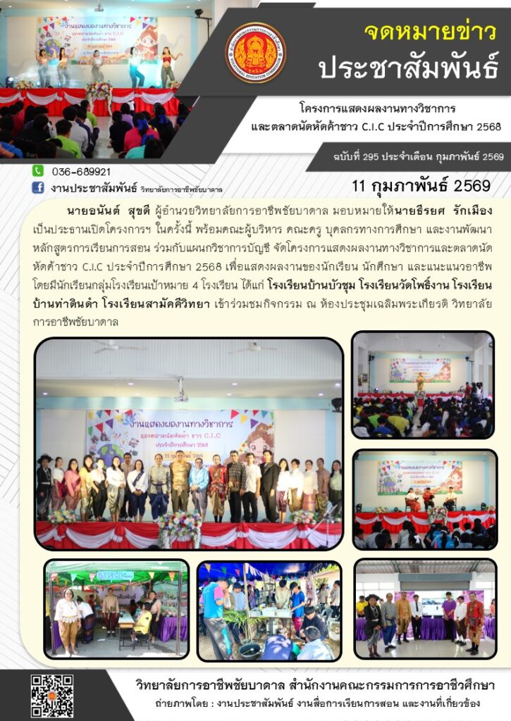 งานพัฒนาหลักสูตรการเรียนการสอน ร่วมกับแผนกวิชาการบัญชี จัดโครงการแสดงผลงานทางวิชาการฯ ประจำปีการศึกษา 2568 ณ ห้องประชุมเฉลิมพระเกียรติ วิทยาลัยการอาชีพชัยบาดาล