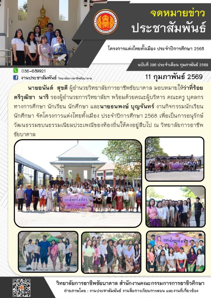 งานกิจกรรมนักเรียน นักศึกษา จัดโครงการแต่งไทยทั้งเมือง ประจำปีการศึกษา 2568 เพื่อเป็นการอนุรักษ์วัฒนธรรมขบนธรรมเนียมประเพณีของท้องถิ่นให้คงอยู่สืบไป ณ วิทยาลัยการอาชีพชัยบาดาล