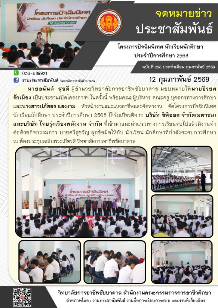 งานแนะแนวอาชีพและจัดหางาน จัดโครงการปัจฉิมนิเทศ นักเรียนนักศึกษา ประจำปีการศึกษา 2568 และกิจกรรมการ บายศรีสู่ขวัญ ผูกข้อมือให้กับ นักเรียน นักศึกษาที่กำลังจะจบการศึกษา ณ ห้องประชุมเฉลิมพระเกียรติ วิทยาลัยการอาชีพชัยบาดาล
